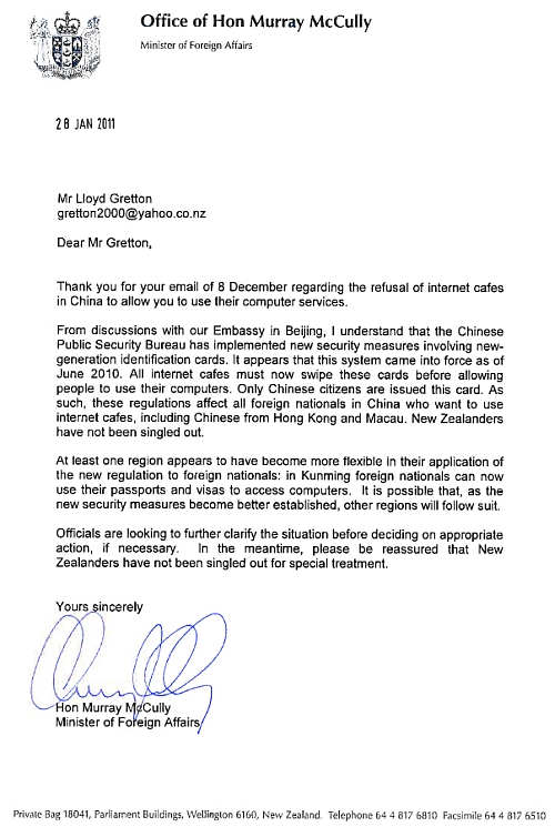 Thank you for your letter to me. As you said these Internet restrictions are to do with national security. New Zealanders or any other nationals have not been singled out.